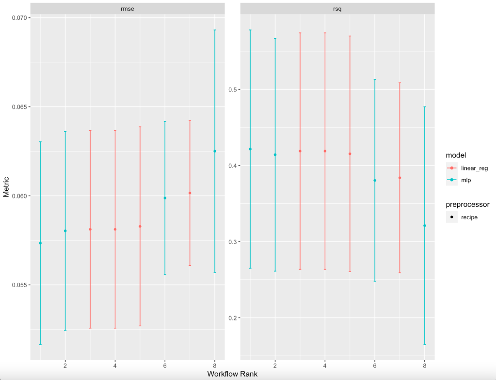 #16 filtered_nnet rsq 0.321 0.0949 5 8Two metrics are listed when ranking all eight models: root mean square error (rmse) and R-squared (rsq), thus giving 16 lines in a new tibble. It turns out that the basic neural network had the best results. But, just for fun, let’s look at a graph of these summary statistics for all eight models: