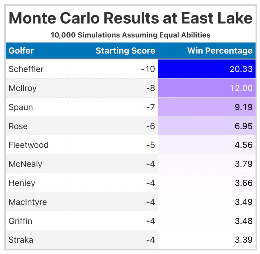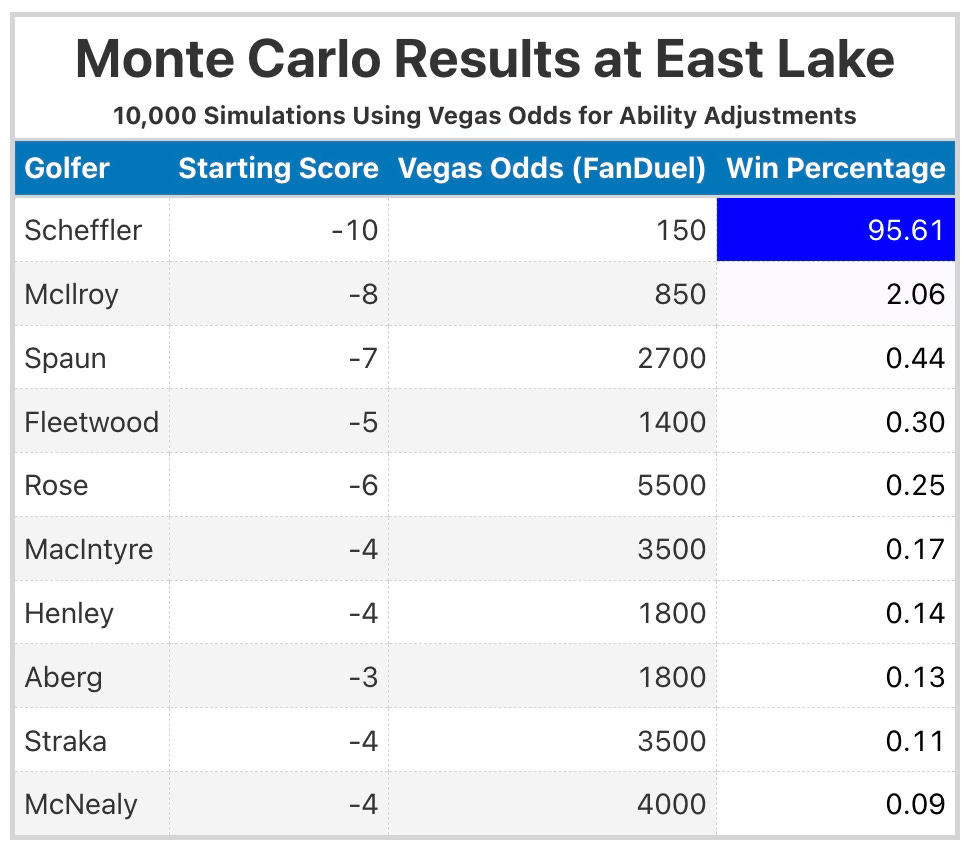 Even though Scheffler is a sizable favorite to become golf’s first repeat winner of this massive payday (+150 on FanDuel), we can figure out how much this rule change affects his probability to win by using Monte Carlo simulations. In other words, we can recreate the TOUR Championship multiple times and determine how often Scheffler is the winner.